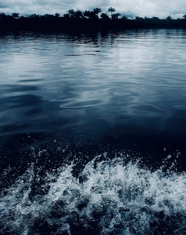 Water splashes against the boat as we approach the jungle in the distance, Amazon River, Peru.